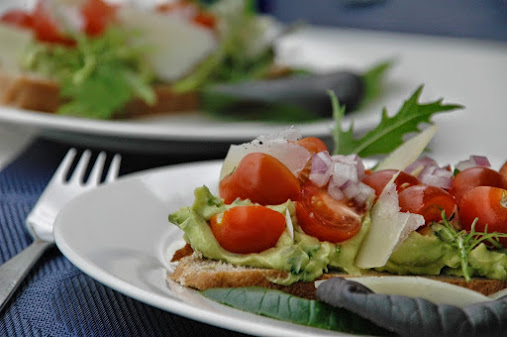Bruchetta kommer fra Italia og er rett og slett en grillet skive med hvitløk, olje, toppet med forskjellige ting alt fra fisk, kjøtt og grønnsaker. Bruchetta brukes ofte som forrett i Italia, men er så godt at det holder med et måltid bare med bruchetta. Jeg har servert brucheta til lunsj i dag hovedsaklig med avocado og tomat.